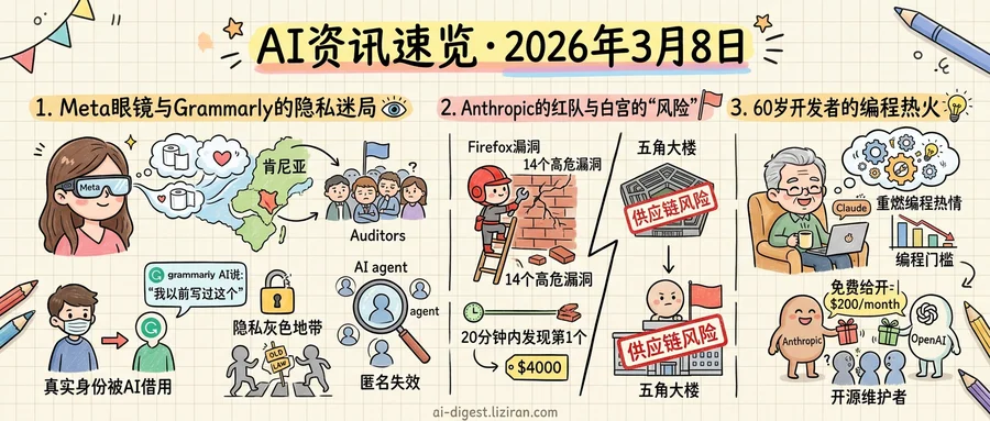 01Meta眼镜私密画面被发往肯尼亚,Grammarly擅用真人身份,研究显示AI可识破匿名账号