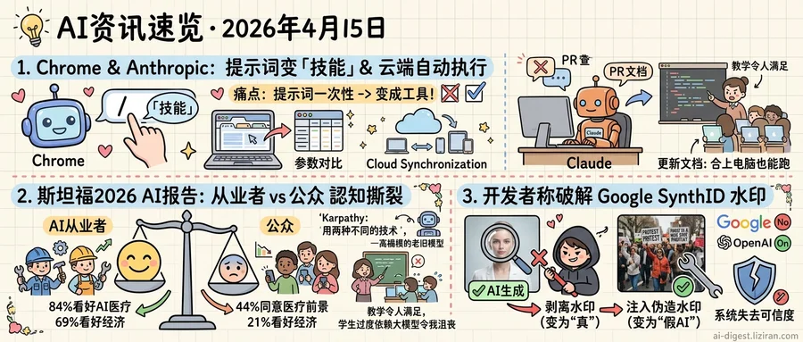 Chrome上线了「技能」功能:用户可以把写好的提示词存下来,之后在任意网页上输入斜杠一键调用。一个技能能同时跑在多个标签页上,比如选中三个商品页一键生成参数对比表格,还能跨设备同步。